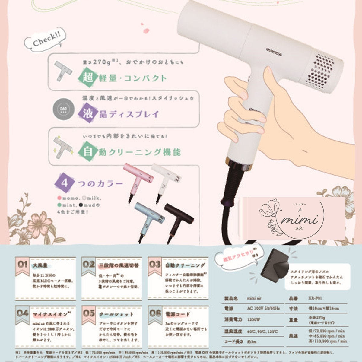 mimi airは、女性目線で可愛さと使いやすさを形にした、超軽量マイナスイオンへアドライヤーです。